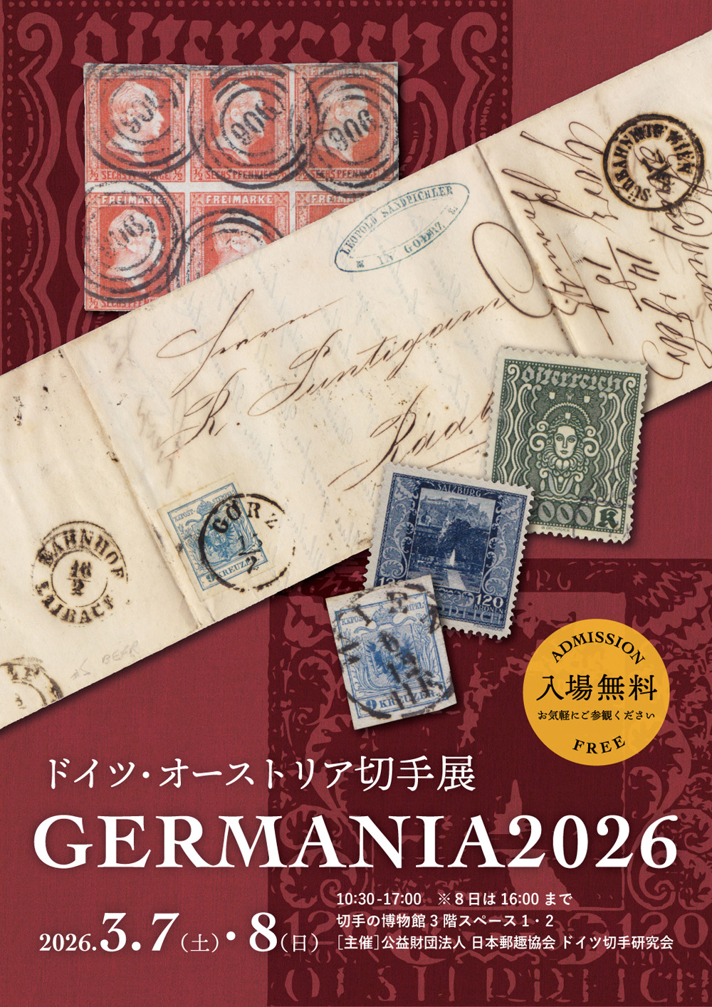 | JPSドイツ切手研究会 入会のご案内 JPSドイツ切手研究会は、1978年9月に発足し、JPS会員を中心に全国規模で組織・運営されているドイツ切手愛好家の集まりです。 ドイツ切手にご興味をお持ちの方、当研究会への入会ご希望の方は下記へご連絡下さい。 活動概要 ・研究会報発行 6回/年 研究会報「ドイツ切手研究会報」 内容はドイツ切手に関する調査研究や随想、新切手ニュース、関係行事の案内などです。 ・研究発表会(ミニペックス)開催 原則として2年に1回 ![]() ・定例会開催 毎月 第4日曜日 14時40分〜16時 切手の博物館 3階会議室 内容はドイツ切手に関する情報の交換、 各種催事の準備など ・スタンプショウ、JAPEX会場内 ◇研究会紹介ブース設置 ドイツ切手情報の提供、収集の相談、 会員の交流、入会受付など。 年会費 ・運営負担金(会費) 2,000円 (会報PDF会員は1,000円) ・振込先 ・郵便振替 口座名 JPSドイツ切手研究会 口座番号 00150-6-387903 【連絡先】 ・代表世話人 : 加藤 久勝 E-mai:k6255@fa2.so-net.ne.jp ※@は全角です。半角に置き換えて下さい。 |